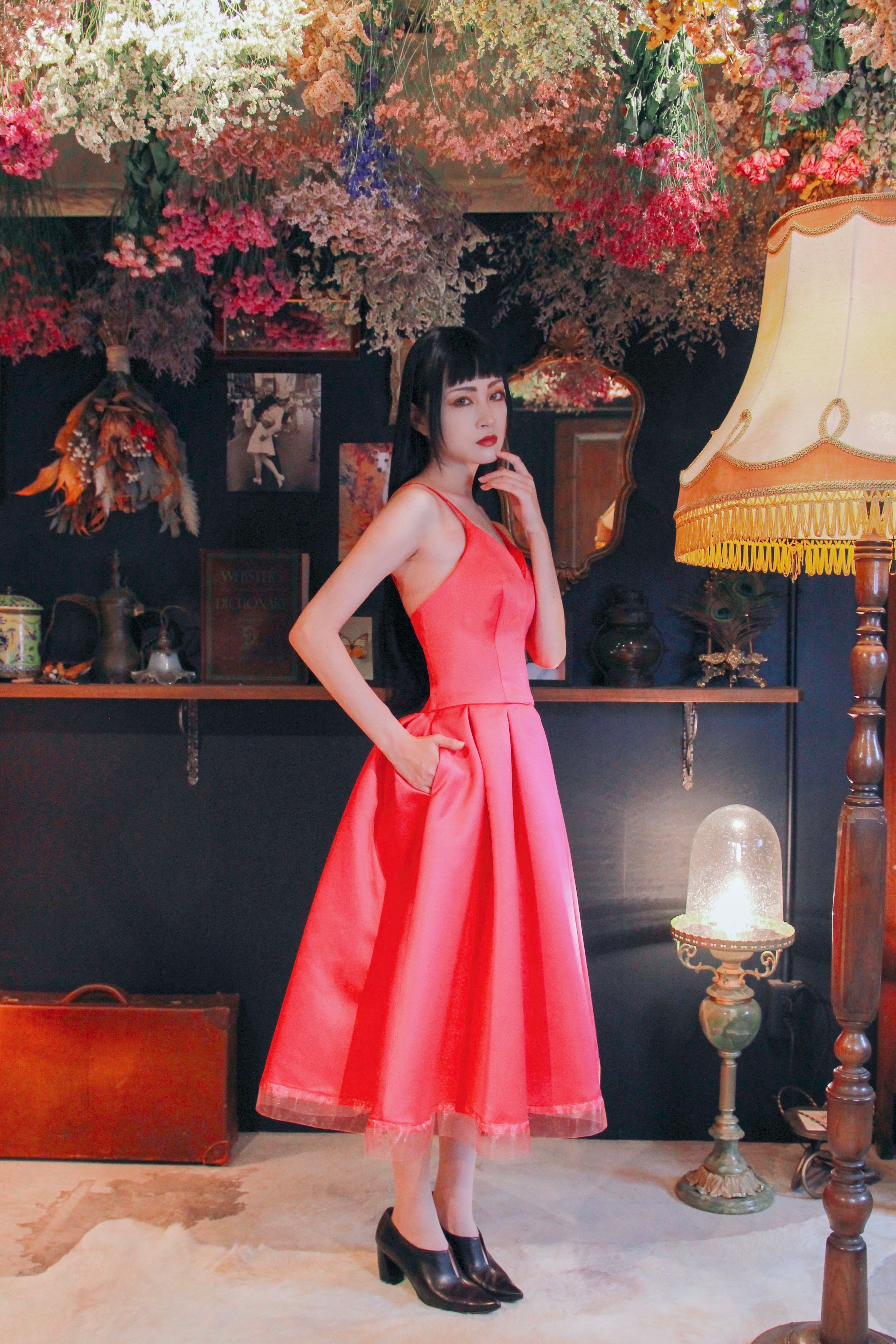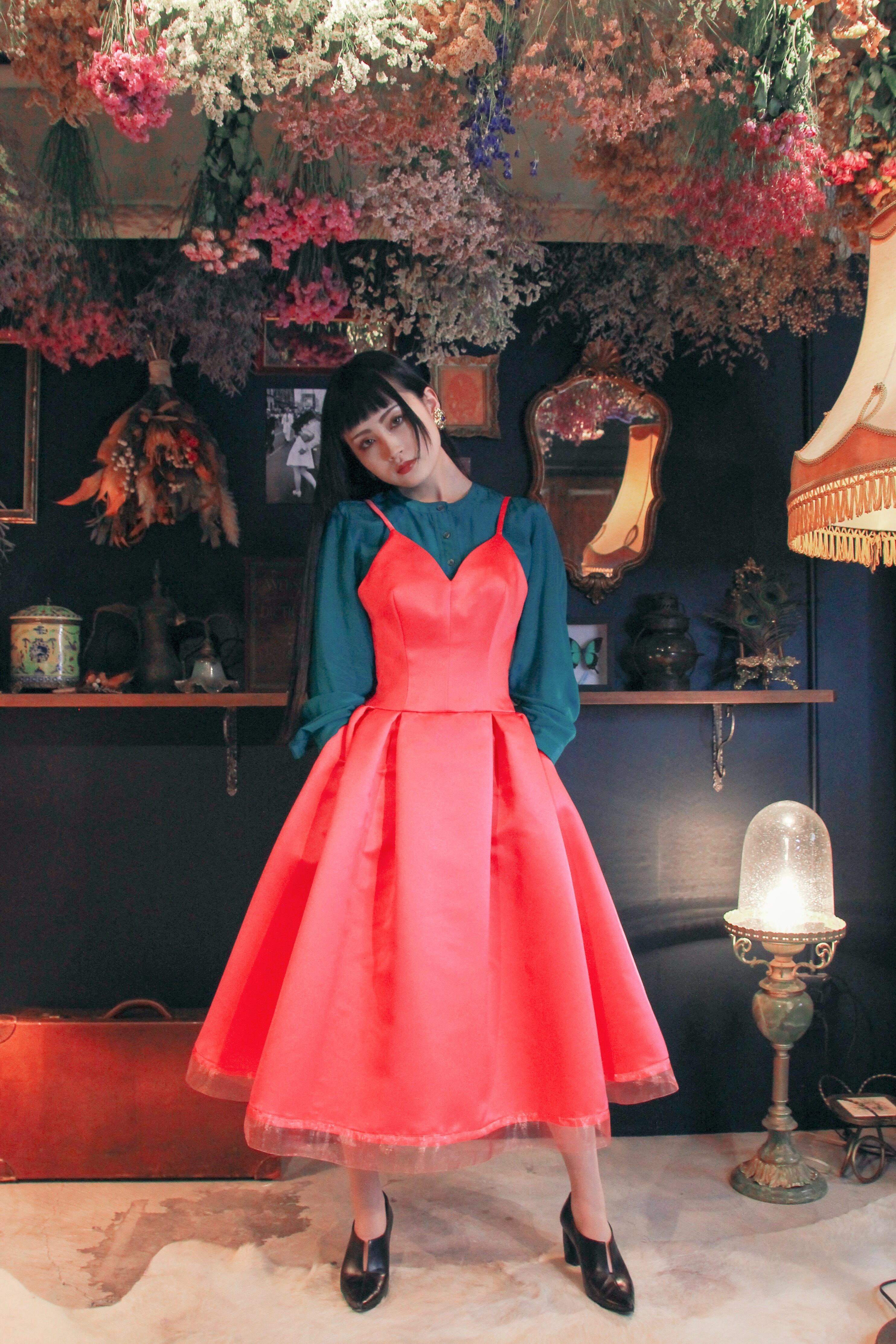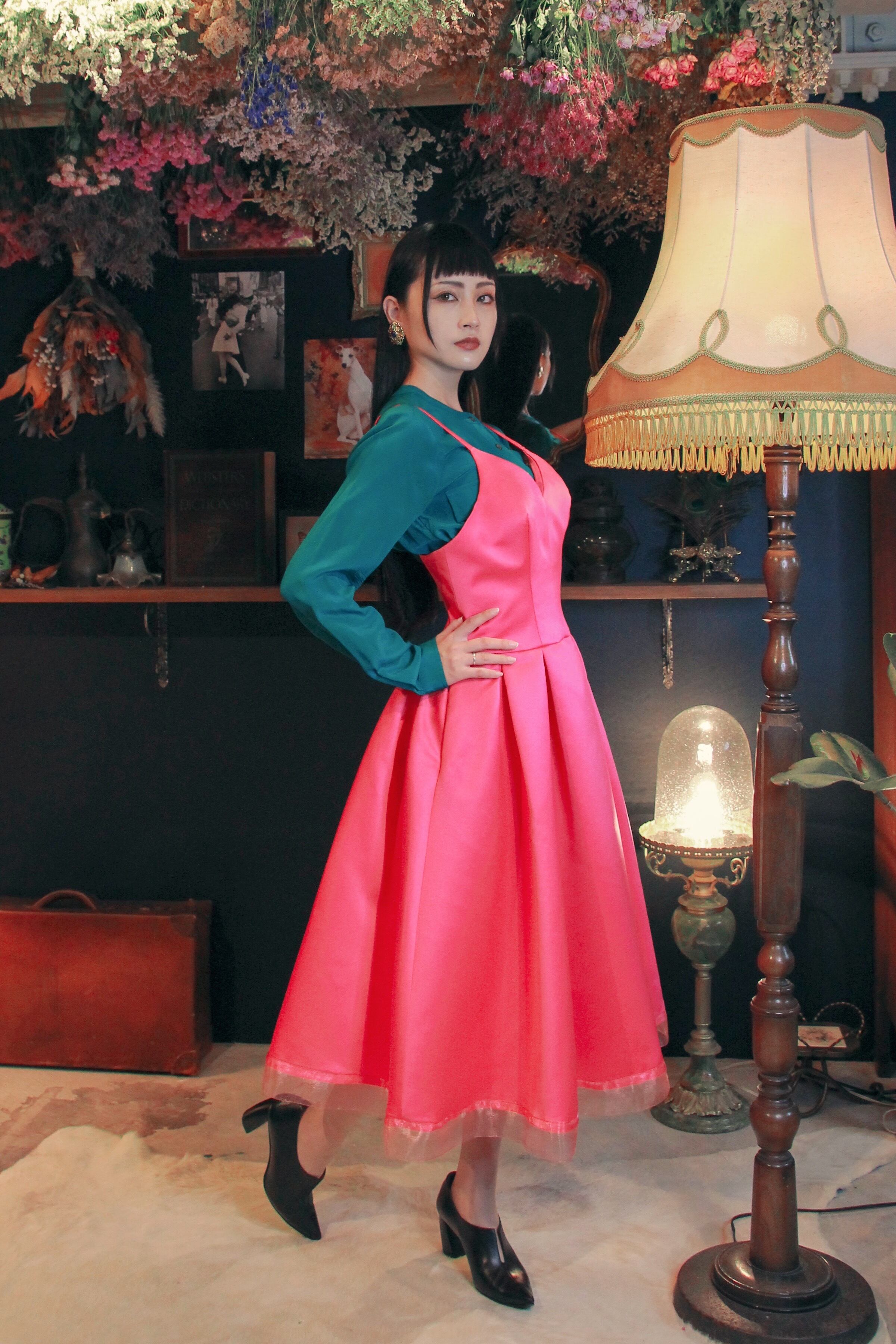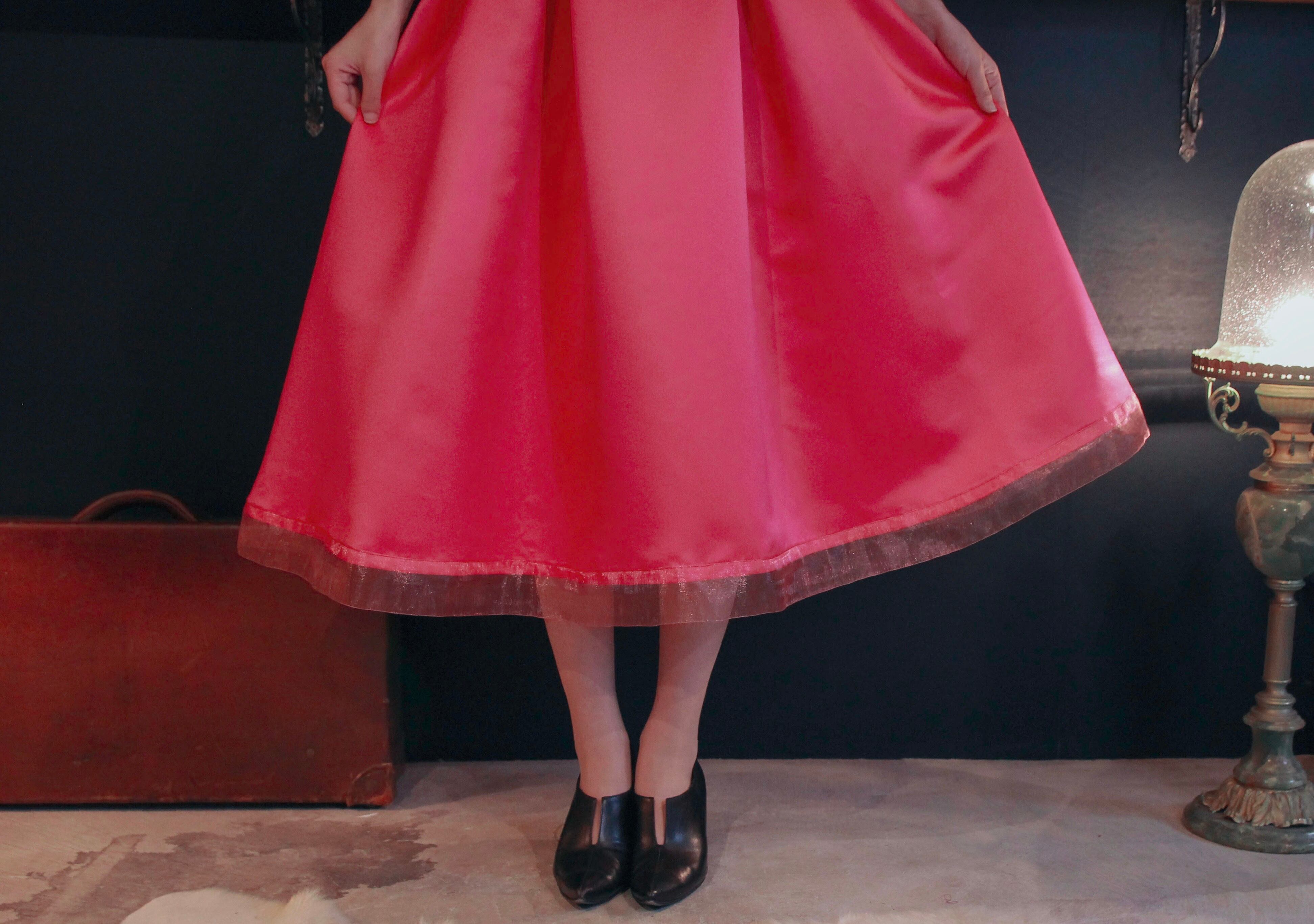 ハリがあり、落ち着いた光沢の美しい生地でのお仕立てですので、パーティドレスにはもちろん、ブラウスやTシャツ等の上に重ねて普段着としてもご着用頂けます。